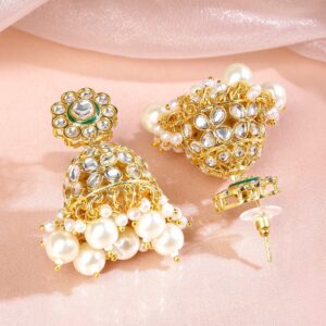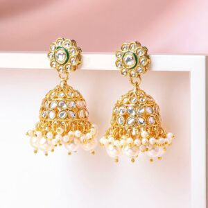 These 18K gold-plated brass jhumka earrings feature floral white Kundan motifs and layered white pearl bead drops—perfect for festive wear, weddings, and traditional ethnic styling. Occasion Styling: Ideal for festive events, traditional ceremonies, family gatherings, or ethnic celebrations. These jhumkas pair beautifully with lehengas, anarkalis, or sarees to elevate your cultural ensembles. Material : & Care Dimension & Size : Length : 5 cm, Width : 2.5 cm Material : Brass Weight : 33.95 Gram Net Qnty : 1 Pair Earrings Care Label :It is advisable to avoid contact with water and organic chemicals i.e. perfume sprays. Store jewellery in airtight box. After use, wipe the jewellery with soft cotton cloth