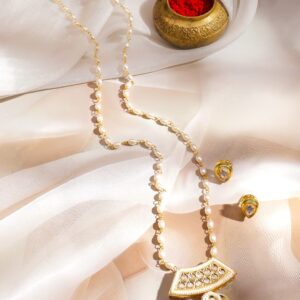 Necklace : 18K gold-plated necklace set with lustrous white pearl beads and dazzling kundan stones, offering timeless elegance for weddings, festive celebrations, and party occasions. Perfect for Traditional Styling: Ideal for sangeet, mehendi, festive gatherings or pairing with sarees and traditional suits, this necklace balances subtlety with heritage-inspired detailing. Material & Care Dimension : Length : Necklace : 26 cm ; Earring : 3 Width : Necklace : 1 cm ; Earring : 1.5 Material: Brass Net Weight: 23.43 Gram Net Quantity: 1 Necklace and 1 Pair of Earrings Care Label: It is advisable to avoid contact with water and organic chemicals i.e. perfume sprays. Store jewellery in airtight box. After use, wipe the jewellery with soft cotton cloth.