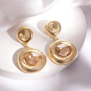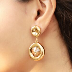 Earrings: Elevate your look with these 18K gold-plated drop earrings, featuring bold circular shapes and sparkling yellow crystal stones for a luxurious and chic statement. Occasion : Bring your style to a whole new level with this handcrafted piece of jewellery. When you’re celebrating a special Occasion : – a birthday, wedding, or personal milestone – this piece adds that extra something that makes us feel special and looking our best. Material : & Care Dimension :Length : 5.5 cm, Width: 2.7 cm Material :Brass Care Label : It is advisable to avoid contact with water and organic chemicals i.e. perfume sprays. Store jewellery in airtight box. After use, wipe the jewellery with soft cotton cloth.