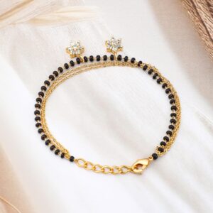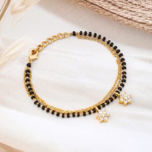 Bracelet :This elegant mangalsutra bracelet by features 18K gold plating with delicate black & gold beads. Adorn with sparkling zirconia drop charms,it offers a contemporary twist to a traditional style. Occasion : Bring your style to a whole new level with this handcrafted piece of jewellery. When you’re celebrating a special Occasion : – a birthday, wedding, or personal milestone – this piece adds that extra something that makes us feel special and looking our best. Material : & Care Dimension : Length : 15 cm, Width : 2 cm Net Weight: 25g Net Quantity : 1 Bracelet Material :Brass Care Label : It is advisable to avoid contact with water and organic chemicals i.e. perfume sprays. Store jewellery in airtight box. After use, wipe the jewellery with soft cotton cloth.