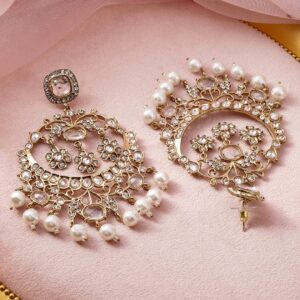 Earrings : These stunning 18K light gold tone plated chandbali earrings are adorned with shimmering cubic zirconia stones, adding a touch of glamour to any look. The intricate design is beautifully complemented by delicate pearl accents, creating an elegant and timeless piece. Perfect for special occasions, these earrings are designed to make you stand out with their luxurious craftsmanship and exquisite detailing. Occasion : Bring your style to a whole new level with this handcrafted piece of jewellery. When you’re celebrating a special Occasion : – a birthday, wedding, or personal milestone – this piece adds that extra something that makes us feel special and looking our best. Material : & Care Dimension : Size : Length : 11 cm, Width : 6.5 cm Material: Brass Net Weight: 58.3 Gram Net Quantity: 1 Pair of Earrings Care Label: It is advisable to avoid contact with water and organic chemicals i.e. perfume sprays. Store jewellery in airtight box. After use, wipe the jewellery with soft cotton cloth.