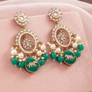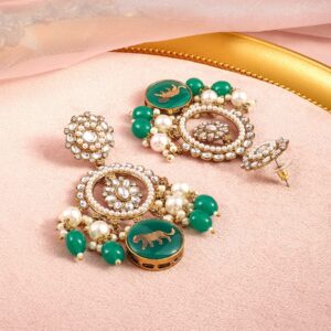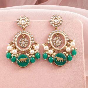 Earrings : Discover elegance with the Gold-Plated design, meticulously crafted for those who cherish luxury. This piece features precious stones for an eye-catching sparkle, making it perfect for special occasions. With a blend of high-quality materials and exquisite design, it promises both durability and style. The versatile look can complement a variety of outfits, adding a touch of sophistication. A must-have for enhancing your accessory collection with timeless elegance. Occasion : Bring your style to a whole new level with this handcrafted piece of jewellery. When you’re celebrating a special Occasion : – a birthday, wedding, or personal milestone – this piece adds that extra something that makes us feel special and looking our best. Material : & Care Dimension : Length : 7.9 cm, Width: 5 cm Material :Brass Weight : 33.2g Net Qnty : 1 Pair Earrings Care Label : It is advisable to avoid contact with water and organic chemicals i.e. perfume sprays. Store jewellery in airtight box. After use, wipe the jewellery with soft cotton cloth.