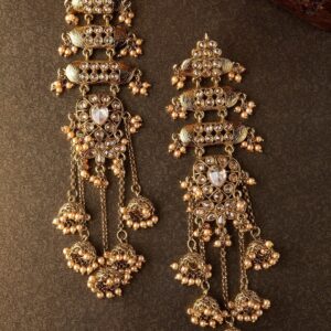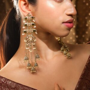 Statement Jhumka : Drape yourself in heritage luxury with these 18K mehndi gold-plated jhumka earrings, featuring layered Kundan-studded elements with cascading filigree jhumkas & pearl hangings, perfect for weddings & festive occasions. Occasion : Bring your style to a whole new level with this handcrafted piece of jewellery. When you’re celebrating a special Occasion : – a birthday, wedding, festive or personal milestone – this piece adds that extra something that makes us feel special and looking our best. Material & Care Dimension : Length 16cm Material : Brass Care Label : It is advisable to avoid contact with water and organic chemicals i.e. perfume sprays. Store jewellery in airtight box. After use, wipe the jewellery with soft cotton cloth.