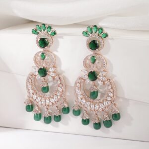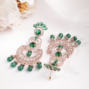 Earrings : ‘ 18K rose gold-plated long chandbali earrings are studded with zirconia and feature emerald green beads, blending traditional design with modern elegance for a statement look. Occasion : Bring your style to a whole new level with this handcrafted piece of jewellery. When you’re celebrating a special Occasion : – a birthday, wedding, or personal milestone – this piece adds that extra something that makes us feel special and looking our best. Material : & Care Dimension : Length : 8cm, Width: 3.5w Material :Alloy Care Label : It is advisable to avoid contact with water and organic chemicals i.e. perfume sprays. Store jewellery in airtight box. After use, wipe the jewellery with soft cotton cloth.