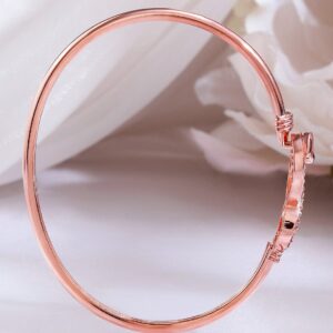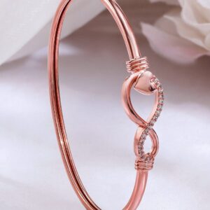 This 18K rose gold-plated bracelet features an elegant infinity loop with a heart motif and crystal zirconia accents—crafted for romantic everyday elegance with a sleek, modern finish. Occasion : Bring your style to a whole new level with this handcrafted piece of jewellery. When you’re celebrating a special Occasion : – a birthday, daily minimal, festive, party or personal milestone – this piece adds that extra something that makes us feel special and looking our best. Material & Care Dimension : Length: 2.6 cm ; Width: 1 cm Material: Brass Net Weight: 5.25 Gram Net Quantity: 1 Bracelet Care Label: It is advisable to avoid contact with water and organic chemicals i.e. perfume sprays. Store jewellery in airtight box. After use, wipe the jewellery with soft cotton cloth.