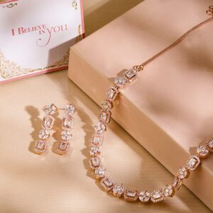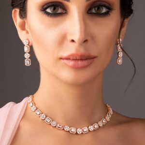 It’s a jewellery set fit for the queens! Exude the royal vibe with this stone studded jewellery set. Consisting of a necklace, matching earrings, this necklace set is crafted from 18k rose gold-plated brass, stones and beads. Occasion : Bring your style to a whole new level with this handcrafted piece of jewellery. When you’re celebrating a special Occasion : – a birthday, wedding, or personal milestone – this piece adds that extra something that makes us feel special and looking our best. Material : & Care Dimension : Necklace 38.4 cm; Earrings 3.8 cm; Material : Brass Collection : Cubic Zirconia & AD(Rose Gold) Weight : 35g Net Qnty : 1 Necklace, 1 Pair of Earrings Care Label : It is advisable to avoid contact with water and organic chemicals i.e. perfume sprays. Store jewellery in airtight box. After use, wipe the jewellery with soft cotton cloth.