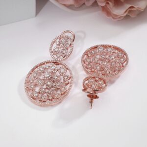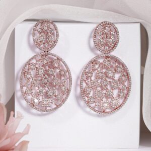 Earrings : 18K rose gold-plated premium drop earrings, intricately studded with white cubic zirconia. A statement accessory, perfect for adding sparkle and elegance to any look. Occasion : Bring your style to a whole new level with this handcrafted piece of jewellery. When you’re celebrating a special Occasion : – a birthday, wedding, or personal milestone – this piece adds that extra something that makes us feel special and looking our best. Material : & Care Dimension : Length : 6CM, Width: 3.8CM Material: Alloy Net Weight: 17 Gram Net Quantity: 1 Pair of Earrings Care Label: It is advisable to avoid contact with water and organic chemicals i.e. perfume sprays. Store jewellery in airtight box. After use, wipe the jewellery with soft cotton cloth.