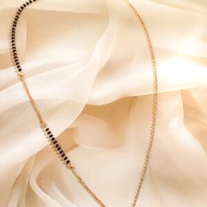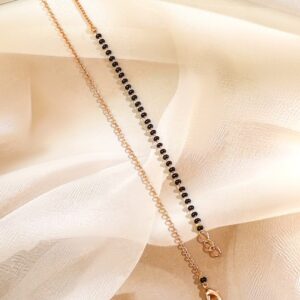 Mangalsutra Set : This 18K Rose Gold-Plated mangalsutra features a white cubic zirconia-studded round pendant with a sparkling border and black beaded chain. A minimal yet stylish pick for elegant daily wear. Occasion : Bring your style to a whole new level with this handcrafted piece of jewelry. When you’re celebrating a daily minimal, weddings, festive occasions & traditional ceremonies, this piece adds that extra something that makes us feel special and looking our best. Material & Care Dimension : Length Size : Necklace : 24 cm Dimension : Width : Necklace : 1.5 cm Net Quantity : 1 Necklace Net Weight: 5.76 g Material : Brass Care Label : It is advisable to avoid contact with water and organic chemicals i.e. perfume sprays. Store jewellery in airtight box. After use, wipe the jewellery with soft cotton cloth.