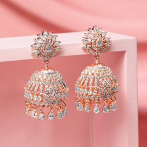 Earrings : Elevate your style with these 18K rose gold-plated statement jhumka earrings, encrusted with brilliant white cubic zirconia stones. The intricate sunburst stud design and dangling teardrop embellishments create an opulent and regal look, making them ideal for weddings and grand celebrations. Occasion : Bring your style to a whole new level with this handcrafted piece of jewellery. When you’re celebrating a special Occasion : – a birthday, wedding, or personal milestone – this piece adds that extra something that makes us feel special and looking our best. Material : & Care Dimension : Size : Length : 5 cm, Width : 2 cm Net Quantity : 1 Pair Of Earrings Net Weight: 24.75 g Material :Brass Care Label : It is advisable to avoid contact with water and organic chemicals i.e. perfume sprays. Store jewellery in airtight box. After use, wipe the jewellery with soft cotton cloth.