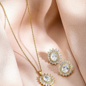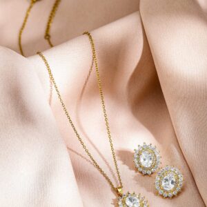 Jewellery Set : This exquisite piece, ‘ 18KT Gold-Plated Crystal-Studded Jewellery Set’, is a perfect blend of elegance and craftsmanship. Designed to captivate, it reflects timeless beauty and intricate detailing. Ideal for special occasions, this accessory adds a touch of sophistication to your look. Made with high-quality materials, it guarantees durability and comfort. Elevate your style with this stunning creation, making you stand out effortlessly. Occasion : Bring your style to a whole new level with this handcrafted piece of jewellery. When you’re celebrating a special Occasion : – a birthday, wedding, or personal milestone – this piece adds that extra something that makes us feel special and looking our best. Material : & Care Dimension : Length : 21 cm Width: 1.6 cm Material: Brass Net Weight: 87 Gram Net Quantity: 1 Necklace & 1 Pair of Earrings Care Label : It is advisable to avoid contact with water and organic chemicals i.e. perfume sprays. Store jewellery in airtight box. After use, wipe the jewellery with soft cotton cloth.