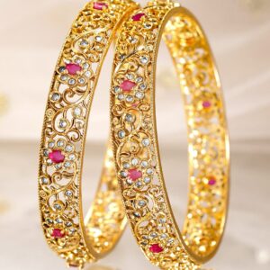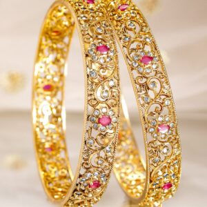 Bangle : This exquisite piece, ‘ 2 Pieces 22KT Gold-Plated CZ Stone Studded Bangles’, is a perfect blend of elegance and craftsmanship. Designed to captivate, it reflects timeless beauty and intricate detailing. Ideal for special occasions, this accessory adds a touch of sophistication to your look. Made with high-quality materials, it guarantees durability and comfort. Elevate your style with this stunning creation, making you stand out effortlessly. Occasion : Bring your style to a whole new level with this handcrafted piece of jewellery. When you’re celebrating a special Occasion : – a birthday, wedding, or personal milestone – this piece adds that extra something that makes us feel special and looking our best. Material : & Care Material: Brass Net Weight: 37.67 Gram Net Quantity: 2 Bangles Care Label : It is advisable to avoid contact with water and organic chemicals i.e. perfume sprays. Store jewellery in airtight box. After use, wipe the jewellery with soft cotton cloth.