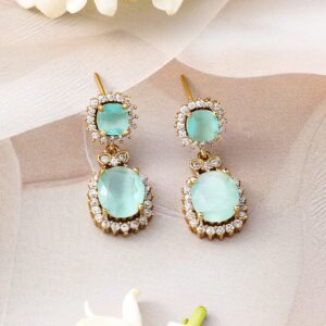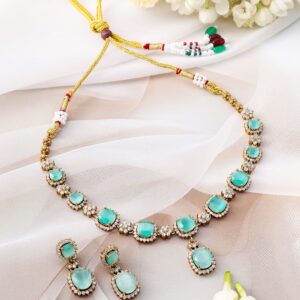Experience elegance with this 22K gold-plated necklace set featuring aqua green stones and cubic zirconia, paired with matching earrings. A perfect blend of luxury and charm for traditional and modern attire. Material : & Care Dimension : Necklace & Earrings : 13 cm / 3 cm Width : 2 cm / 2 cm Material: Brass Net Weight: 31.28 Gram Net Quantity: 1 Necklace & 1 Pair of Earrings Care Label: It is advisable to avoid contact with water and organic chemicals i.e. perfume sprays. Store jewellery in airtight box. After use, wipe the jewellery with soft cotton cloth.