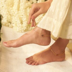 PRODUCT DETAILS : Introducing our 22K Gold-Plated Beaded Sleek Anklets – a perfect blend of simplicity and elegance. These anklets feature delicate gold plating and subtle beading, creating a sleek and timeless accessory for your ankles. Elevate your style with the understated charm of these anklets, perfect for adding a touch of sophistication to any look. Step into elegance with our beautifully crafted gold-plated anklets. Occasion : Bring your style to a whole new level with this handcrafted piece of jewellery. When you’re celebrating a special Occasion : – a birthday, wedding, or personal milestone – this piece adds that extra something that makes us feel special and looking our best. Material & Care Dimension : Free Size Material : Brass Care Label : It is advisable to avoid contact with water and organic chemicals i.e. perfume sprays. Store jewellery in airtight box. After use, wipe the jewellery with soft cotton cloth.