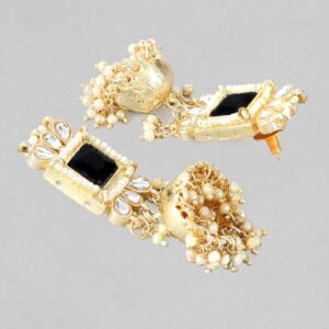 Necklace Set : Make a statement with this stunning 22K Gold-Plated Choker Set, featuring bold black stones intricately set within a luxurious Kundan framework. The choker is adorned with delicate pearl drops, adding a touch of elegance and sophistication. The matching jhumka earrings mirror the choker€™s design, creating a cohesive and glamorous look perfect for special events. The combination of rich black stones, gleaming gold, and classic pearls offers a timeless appeal that will elevate any traditional ensemble. Occasion : Bring your style to a whole new level with this handcrafted piece of jewellery. When you’re celebrating a special Occasion : – a birthday, wedding, or personal milestone – this piece adds that extra something that makes us feel special and looking our best. Material : & Care Dimension : Size: Necklace : 18.5 cm, Earrings : 3.5 cm Material: Brass Net Weight: 69 Gram Net Quantity: 1 Necklace & 1 Pair of Earrings Care Label: It is advisable to avoid contact with water and organic chemicals i.e. perfume sprays. Store jewellery in airtight box. After use, wipe the jewellery with soft cotton cloth.