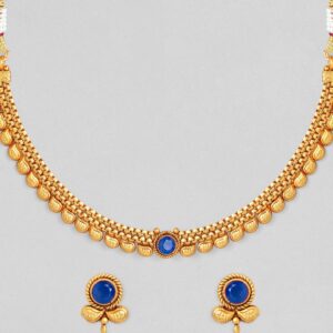 Necklace Set : This 22K gold-plated traditional necklace set features luxurious blue sapphire stones with pearl accents, offering an elegant and timeless design to complement your ethnic wear. A statement piece for any grand occasion. Occasion : Bring your style to a whole new level with this handcrafted piece of jewellery. When you’re celebrating a special Occasion : – a birthday, wedding, festive or personal milestone – this piece adds that extra something that makes us feel special and looking our best. Material : & Care Dimension : Length : NS- 15 ; E- 1.5 cm Width: NS- 3.4 ; E- 1.3 cm Material: Brass Net Weight: 24.86 Gram Net Quantity: 1 Necklace & 1 Pair of Earrings Care Label: It is advisable to avoid contact with water and organic chemicals i.e. perfume sprays. Store jewellery in airtight box. After use, wipe the jewellery with soft cotton cloth.