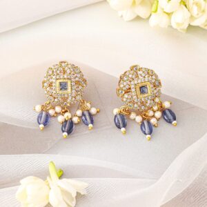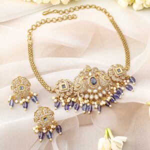 22K gold-plated traditional choker set featuring vibrant blue stones, cubic zirconia accents, and elegant blue and pearl bead drops. A stunning choice for ethnic elegance. Material & Care Dimension : Length : Necklace : 11 cm Earrings : 3.5 cm Width : Necklace : 9 cm Earrings : 2 cm Material: Brass Net Weight: 42,98 Gram Net Quantity: 1 Necklace & 1 Pair of Earrings Care Label: It is advisable to avoid contact with water and organic chemicals i.e. perfume sprays. Store jewellery in airtight box. After use, wipe the jewellery with soft cotton cloth.