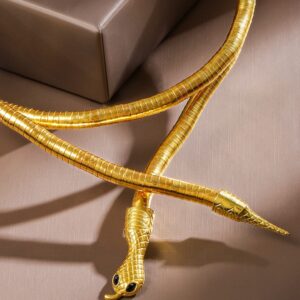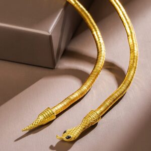 Necklace and Chains : Elevate your style with this bold and mesmerizing golden serpent wrap necklace. Designed to coil gracefully around the neck, the intricately detailed snake head features striking black gemstone eyes, exuding power and elegance. A statement piece for those who dare to stand out! Occasion : Bring your style to a whole new level with this handcrafted piece of jewellery. When you’re celebrating a special Occasion : – a birthday, wedding, or personal milestone – this piece adds that extra something that makes us feel special and looking our best. Material : & Care Dimension : Size : Length : 30 cm, Width: 1 cm Net Weight: 60g Net Quantity : 1 Necklace Material : Care Label : It is advisable to avoid contact with water and organic chemicals i.e. perfume sprays. Store jewellery in airtight box. After use, wipe the jewellery with soft cotton cloth.