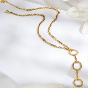 Necklace & Chains: 22K gold-plated brass necklace featuring three textured circular pendants with white Cubic Zirconia stones, perfect for daily wear and party styling. Perfect for All Occasions: Ideal for daily wear, festive gatherings, dinner dates or office chic styling. Material : & Care Dimension : Length : 35 cm, Width: 1.5 cm Material : Brass Net Weight : 25 Gram Net Quantity : 1 Necklace & Chains Care Label : It is advisable to avoid contact with water and organic chemicals i.e. perfume sprays. Store jewellery in airtight box. After use, wipe the jewellery with soft cotton cloth.