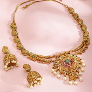 Necklace Set : Discover elegance with the Gold-Plated design, meticulously crafted for those who cherish luxury. This piece features precious stones for an eye-catching sparkle, making it perfect for special occasions. With a blend of high-quality materials and exquisite design, it promises both durability and style. The versatile look can complement a variety of outfits, adding a touch of sophistication. A must-have for enhancing your accessory collection with timeless elegance. Occasion : Bring your style to a whole new level with this handcrafted piece of jewellery. When you’re celebrating a special Occasion : – a birthday, wedding, or personal milestone – this piece adds that extra something that makes us feel special and looking our best. Material : & Care Dimension : Length : 30 cm / 1.5 cm, Width: 3.5 cm /2 cm Material :Brass Care Label : It is advisable to avoid contact with water and organic chemicals i.e. perfume sprays. Store jewellery in airtight box. After use, wipe the jewellery with soft cotton cloth.