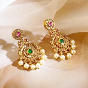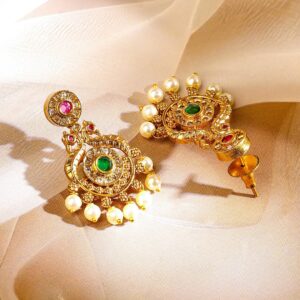 Experience the divine elegance of 22K gold-plated temple jewellery set, intricately designed with Ruby, Emerald, and CZ (Cubic Zirconia) stones. This exquisite set showcases traditional motifs, adorned with lustrous pearl accents that enhance its regal appeal. The set includes a stunning necklace and matching earrings, crafted to perfection, making it a splendid addition to your collection. Perfect for enhancing your traditional look, this temple jewellery set embodies timeless beauty and cultural heritage, ideal for weddings and festive celebrations. Material : & Care Dimension : Necklace Length: 14 cm / 5 cm Width 3.7 cm / 2 cm Material : Brass Care Label : It is advisable to avoid contact with water and organic chemicals i.e. perfume sprays. Store jewellery in airtight box. After use, wipe the jewellery with soft cotton cloth.