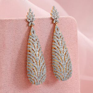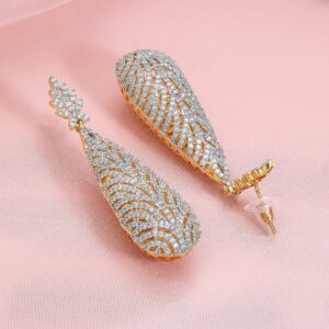 Elegant 22K gold-plated statement drop earrings, intricately studded with sparkling cubic zirconia, showcasing a premium and sophisticated design for a luxurious look. Material & Care Dimension : Length : 6.5 cm ; Width : 2 cm Material: Brass Net Weight: 23.36 Gram Net Quantity: 1 Pair of Earrings Care Label: It is advisable to avoid contact with water and organic chemicals i.e. perfume sprays. Store jewellery in airtight box. After use, wipe the jewellery with soft cotton cloth.