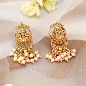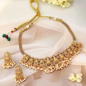 This exquisite 22K gold-plated temple jewellery set features a divine Lakshmi motif with intricate detailing and pearl accents, radiating traditional elegance. Perfect for elevating your festive and wedding look. Occasion : Bring your style to a whole new level with this handcrafted piece of jewellery. When you’re celebrating a special Occasion : – a birthday, wedding, festive or personal milestone – this piece adds that extra something that makes us feel special and looking our best. Material & Care Dimension : Length : Necklace : 13 cm ; Earrings : 3.5 cm Width : Necklace : 3.5 cm ; Earrings : 1.5 cm Material : Brass Collection : Temple Care Label : It is advisable to avoid contact with water and organic chemicals i.e. perfume sprays. Store jewellery in airtight box. After use, wipe the jewellery with soft