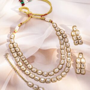 Jewellery Set : This 22K gold-plated handcrafted necklace set features white kundan stones in a double-layer design. Comes with earrings and maangtikka. Made from premium brass material for timeless festive elegance. Versatile & Occasion- Perfect: Ideal for bridesmaids, classic festive events, and traditional functions. Pair it with sarees, suits, or lehengas for a graceful and effortlessly chic look. A versatile staple for any festive or ethnic wardrobe. Material : & Care Dimension : Length : Necklace : 14 cm, Earrings : 4.5 cm Width : Necklace : 2 cm, Earrings : 2 cm Net Weight: 75.10 Gram Net Quantity : 1 Necklace & 1 Pair of Earrings Material : Brass Care Label : It is advisable to avoid contact with water and organic chemicals i.e. perfume sprays. Store jewellery in airtight box. After use, wipe the jewellery with soft cotton cloth.