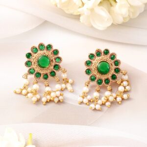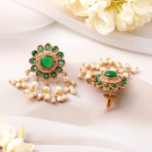 This 22K gold-plated choker jewellery set features emerald green Kundan stones and pearl accents, perfect for enhancing your traditional attire with elegance. Occasion : Bring your style to a whole new level with this handcrafted piece of jewellery. When you’re celebrating a special Occasion : – a birthday, wedding, or personal milestone – this piece adds that extra something that makes us feel special and looking our best. Material : & Care Dimension : Length: 11 cm / 5 cm Width : 4 cm / 2 cm Material: Brass Net Weight: 41.86 Gram Net Quantity: 1 Necklace & 1 Pair of Earrings Care Label: It is advisable to avoid contact with water and organic chemicals i.e. perfume sprays. Store jewellery in airtight box. After use, wipe the jewellery with soft cotton cloth.
