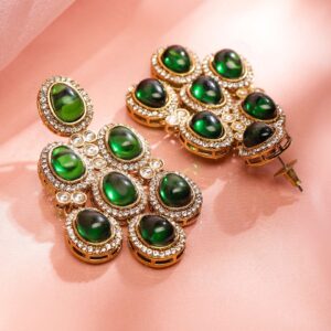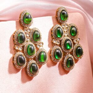 These exquisite 22K gold-plated chandelier earrings feature emerald green oval stones surrounded by sparkling Cubic Zirconia stones. Designed to elevate your style, these earrings offer a perfect balance of luxury and elegance, making them ideal for any special occasion. Material & Care Dimension : Length: 7 cm Dimension : Width: 4.5 cm Net Weight : 37.6 Gram Net Quantity : 1 pair of Ear cuff Earrings Material : Brass Care Label : It is advisable to avoid contact with water and organic chemicals i.e. perfume sprays. Store jewellery in airtight box. After use, wipe the jewellery with soft cotton cloth.