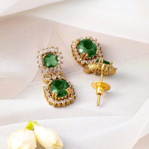 This 22K gold-plated necklace set features elegant emerald green stones and sparkling cubic zirconia, paired with matching earrings for a complete traditional look. Material : & Care Dimension : Length : NS- 15 ; E- 3 cm Width : NS- 1.3 ; E- 1.2 cm Net Quantity : 1 Necklace & 1 Pair of Earrings Weight : 45.32 g Material : Brass Care Label : It is advisable to avoid contact with water and organic chemicals i.e. perfume sprays. Store jewellery in airtight box. After use, wipe the jewellery with soft cotton cloth.