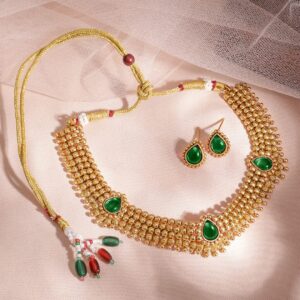 Necklace Set : Discover elegance with the Gold-Plated design, meticulously crafted for those who cherish luxury. This piece features Ruby and Emerald stones for an eye-catching sparkle, making it perfect for special occasions. With a blend of high-quality materials and exquisite design, it promises both durability and style. The versatile look can complement a variety of outfits, adding a touch of sophistication. A must-have for enhancing your accessory collection with timeless elegance. Occasion : Bring your style to a whole new level with this handcrafted piece of jewellery. When you’re celebrating a special Occasion : – a birthday, wedding, or personal milestone – this piece adds that extra something that makes us feel special and looking our best. Material : & Care Dimension : Length : 18 cm / 2.1 cm, Width: 17 cm / 1.3 cm Material: Brass Net Weight: 41.49 Gram Net Quantity: 1 Necklace & 1 Pair of Earrings Care Label: It is advisable to avoid contact with water and organic chemicals i.e. perfume sprays. Store jewellery in airtight box. After use, wipe the jewellery with soft cotton cloth.