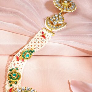 Hair Accessory : This 22K gold-plated handcrafted head jewellery features emerald and ruby kundan stones with cream pearl beads and crescent motifs. Designed for women, perfect for brides and bridesmaids to style for weddings, haldi, and festive occasions. Occasion : Bring your style to a whole new level with this handcrafted piece of jewellery. When you’re celebrating a special Occasion : – a birthday, wedding, parties or personal milestone – this piece adds that extra something that makes us feel special and looking our best. Material & Care Dimension : Length : 44 cm, Width: 3.5 cm Net Weight: 59.97 gram Net Quantity : 1 Hair Accessory Material : Brass Care Label : It is advisable to avoid contact with water and organic chemicals i.e. perfume sprays. Store jewellery in airtight box. After use, wipe the jewellery with soft cotton cloth.