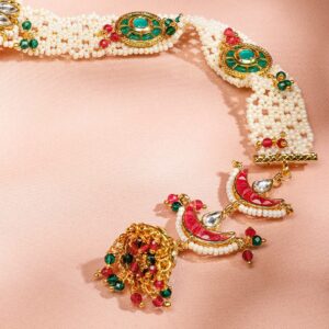 Be the first to review “22K Gold-Plated Emerald & Ruby Kundan Studded Cream Pearl Beaded Handcrafted Head Jewellery for Brides & Bridesmaids”