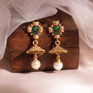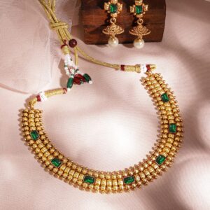 Be the first to review “22K Gold-Plated Emerald Stone Studded Necklace Set with Gold Beads and Pearl Drops – Green”