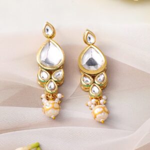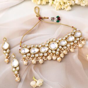 This 22K gold-plated choker set by features glossy pearl beads and dazzling Kundan stones, creating an elegant and luxurious statement piece. Occasion : Bring your style to a whole new level with this handcrafted piece of jewelry. When you’re celebrating a special Occasion : – a birthday, wedding, festive or personal milestone – this piece adds that extra something that makes us feel special and looking our best. Material : & Care Dimension : Length : Necklace : 16 cm; Earrings 6.5 cm Width : Necklace : 7.8 cm; Earrings : 2.2 cm Material: Brass Net Weight: 12.30 Gram Net Quantity: 1 Necklace & 1 Pair of Earrings Care Label: It is advisable to avoid contact with water and organic chemicals i.e. perfume sprays. Store jewellery in airtight box. After use, wipe the jewellery with soft cotton cloth.