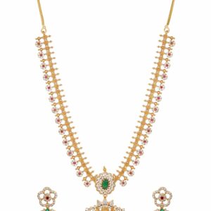 The fusion of elements exudes opulence and sophistication, perfect for enhancing your style. Embrace the captivating allure of this set, allowing the goddess motif, Kemp, Zirconia crystals, and pearls to grace your ensemble with a touch of refined beauty. Let the 22K gold plating and intricate craftsmanship create an aura of timeless charm and exquisite allure, making a statement of grandeur and spiritual grace. Material & Care Dimension : Necklace : 16 cm Earrings : 3.5 cm Material : Brass Care Label : It is advisable to avoid contact with water and organic chemicals i.e. perfume sprays. Store jewellery in airtight box. After use, wipe the jewellery with sof