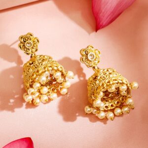 This 22K gold-plated temple jewellery set features an intricately designed Radha Krishna pendant, adorned with golden beads and delicate pearl drops. The handcrafted details exude divine elegance, while the matching jhumka earrings with pearl embellishments enhance its regal charm. A perfect statement piece for weddings, festive occasions, and cultural celebrations. Occasion : Bring your style to a whole new level with this handcrafted piece of jewellery. When you’re celebrating a special Occasion : – a birthday, wedding, or personal milestone – this piece adds that extra something that makes us feel special and looking our best. Material & Care Dimension : Necklace : 60 cm Earrings : 4.5 cm Material : Brass Care Label : It is advisable to avoid contact with water and organic chemicals i.e. perfume sprays. Store jewellery in airtight box. After use, wipe the jewellery with soft