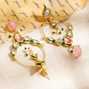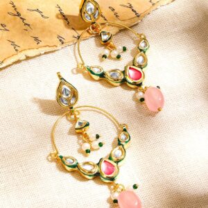 These 22K gold-plated chandbali earrings feature green enamel accents, Kundan stones, and soft pink beads. Their intricate drop design makes them ideal for weddings and traditional attire. Perfect for Weddings: Whether styled with a lehenga or saree, these earrings are a perfect choice for brides, bridesmaids, or guests attending traditional functions, haldi, mehendi, and wedding celebrations. Material & Care Dimension : Length 8.5 cm Width 3.5 cm Material : Brass Weight : 20.96 gram Net Qnty : 1 Pair Earrings Collection : Kundan, Pearls & Beads Care Label : It is advisable to avoid contact with water and organic chemicals i.e. perfume sprays. Store jewellery in airtight box. After use, wipe the jewellery with soft cotton cloth.