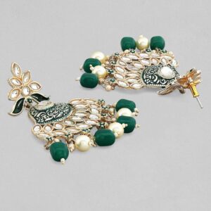 Earrings : Elevate your ethnic ensemble with these exquisite gold-plated Chandelier earrings. Adorned with stunning green and white beads, these earrings feature intricate Kundan stud detailing that adds a regal touch. The elegant floral design is complemented by the charming beaded tassels, making these earrings perfect for adding a hint of luxury to your traditional attire. Ideal for women who appreciate a blend of classic and contemporary styles, these earrings are a beautiful addition to your jewelry collection. Occasion : Bring your style to a whole new level with this handcrafted piece of jewellery. When you’re celebrating a special Occasion : – a birthday, wedding, or personal milestone – this piece adds that extra something that makes us feel special and looking our best. Material : & Care Dimension : Size: Length : 8 cm, Width : 4 cm Material :Alloy Net Weight: 40 Gram Net Quantity: 1 Pair of Earrings Care Label: It is advisable to avoid contact with water and organic chemicals i.e. perfume sprays. Store jewellery in airtight box. After use, wipe the jewellery with soft cotton cloth.