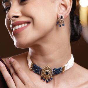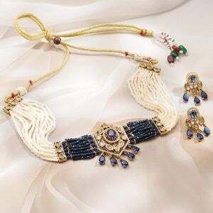 Necklace Set : This handcrafted 22K gold-plated choker set features navy blue cubic zirconia, off-white pearl beads, and kundan detailing—ideal for bridal, festive, and ethnic looks. Occasion Ready: Perfect choice for weddings, receptions, festivals, parties, or special occasions to add a touch of regal elegance Material & Care Dimension : Length : NS = 12 cm ; E = 2.5 cm Width: NS = 3 cm ; E = 1.5 cm Material: Brass Net Weight: 41.61 Gram Net Quantity: 1 Necklace & 1 Pair of Earrings Care Label: It is advisable to avoid contact with water and organic chemicals i.e. perfume sprays. Store jewellery in airtight box. After use, wipe the jewellery with soft cotton cloth.