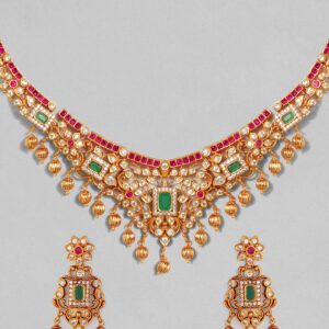 It’s a jewellery set fit for the queens! Exude the royal vibe with this stone studded jewellery set. Consisting of a necklace, matching earrings, this necklace set is crafted from gold-plated brass, stones and beads. Occasion : Bring your style to a whole new level with this handcrafted piece of jewellery. When you’re celebrating a special Occasion : – a birthday, wedding, or personal milestone – this piece adds that extra something that makes us feel special and looking our best. Material & Care Dimension :Necklace: 42.4 cm; Earring: 4.6 cm Material :Copper Care Label : It is advisable to avoid contact with water and organic chemicals i.e. perfume sprays. Store jewellery in airtight box. After use, wipe the jewellery with soft cotton cloth