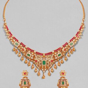 22K Gold Plated Handcrafted Faux Ruby Stone with Gold Beads Traditional Necklace Set – Multicolor