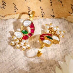 Ear cuff : A 22K gold-plated handcrafted minimal ear cuff, featuring a lotus motif adorned with ruby pink, emerald green, and white Kundan stones, accentuated with a delicate pearl drop. Perfect for weddings, festive occasions & traditional ceremonies. Occasion : Bring your style to a whole new level with this handcrafted piece of jewelry. When you’re celebrating a special Occasion : – a birthday, festive, wedding, or personal milestone – this piece adds that extra something that makes us feel special and looking our best. Material & Care Dimension : Length : 3.5 cm Dimension : Width : 1.6 cm Net Weight: 7 gram Net Quantity : 1 Pair Of Earcuff Material : Brass Care Label : It is advisable to avoid contact with water and organic chemicals i.e. perfume sprays. Store jewellery in airtight box. After use, wipe the jewellery with soft cotton cloth.