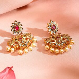 This 22K gold-plated handcrafted choker set features an intricate floral motif with Ruby and white polki stones, adorned with classic pearl beads – ideal for bridal and festive occasions. Occasion – This choker set is perfect for traditional functions, ceremonies, festivals, weddings, in-house functions, and events where you’ll be wearing ethnic outfits. Material & Care Dimension: Length : Necklace 17 cm :: Earring 4.5 cm Material :Brass Plating : Gold Plated Net Quantity : 1 Choker & 1 Pair of Earrings Care Label : It is advisable to avoid contact with water and organic chemicals i.e. perfume sprays. Store jewellery in airtight box. After use, wipe the jewellery with soft cotton cloth.