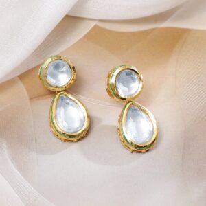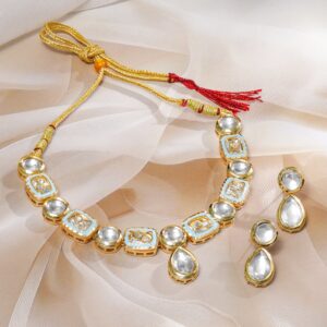 Jewellery Set : This 22K gold-plated choker set features handcrafted white kundan stones with pastel blue enamel detailing and elegant teardrop dangles – a regal piece for weddings and grand festive occasions. Occasion : Bring your style to a whole new level with this handcrafted piece of jewellery. When you’re celebrating a special Occasion : – a birthday, wedding, festive or personal milestone – this piece adds that extra something that makes us feel special and looking our best. Material & Care Dimension : Length : Necklace : 10 cm, Earrings : 3 cm Dimension : Length : Necklace : 2 cm, Earrings : 1.5 cm Collection : Kundan & Enamel Net Quantity : 1 Necklace & 1 pair of Earrings Net Weight: 67.37 gram Material : Brass Care Label : It is advisable to avoid contact with water and organic chemicals i.e. perfume sprays. Store jewellery in airtight box. After use, wipe the jewellery with soft cotton cloth.