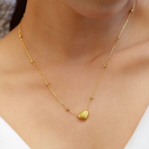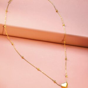 Necklace and Chains : Add a touch of elegance with the 22K Gold-Plated Necklace featuring a radiant heart pendant and delicate bead accents, perfect for a timeless and sophisticated look. Occasion : Bring your style to a whole new level with this handcrafted piece of jewellery. When you’re celebrating a special Occasion : – a birthday, wedding, or personal milestone – this piece adds that extra something that makes us feel special and looking our best. Material : & Care Dimension : – Net Quantity : 1 Necklace Material :Brass Care Label : It is advisable to avoid contact with water and organic chemicals i.e. perfume sprays. Store jewellery in airtight box. After use, wipe the jewellery with soft cotton cloth.