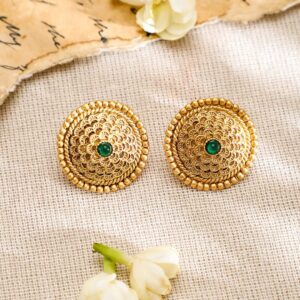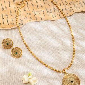 Jewellery Set: This 22K gold-plated traditional jewellery set features an intricately designed pendant and matching earrings, accented with a green stone. Perfect for adding elegance to your cultural attire. Occasion : Bring your style to a whole new level with this handcrafted piece of jewellery. When you’re celebrating a special Occasion : – a birthday, wedding, or personal milestone – this piece adds that extra something that makes us feel special and looking our best. Material : & Care Dimension : Length : 35 cm/ 1 cm Width : 3.5 cm / 1 cm Material: Brass Net Weight: 25 Gram Net Quantity: 1 Necklace & 1 Pair of Earrings Care Label: It is advisable to avoid contact with water and organic chemicals i.e. perfume sprays. Store jewellery in airtight box. After use, wipe the jewellery with soft cotton cloth.
