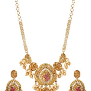 Embrace the captivating allure of this set, allowing the Kemp, zirconia, and pearls to grace your ensemble with a touch of refined beauty. Let the 22K gold plating and intricate craftsmanship create an aura of timeless charm and exquisite allure, making a statement of opulent beauty and luxurious grace. Material & Care Dimension : Necklace : 15 cm Earrings : 5.5 cm Material : Brass Care Label : It is advisable to avoid contact with water and organic chemicals i.e. perfume sprays. Store jewellery in airtight box. After use, wipe the jewellery with soft..
