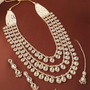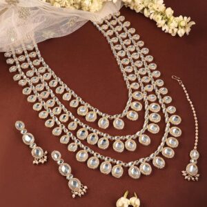 Jewellery Set : This 22K gold-plated bridal set features elegant Kundan and cubic zirconia stones, meticulously designed in a multi-layered pattern for a regal and grand bridal look. Includes matching earrings for a complete ensemble. Occasion : Bring your style to a whole new level with this handcrafted piece of jewellery. When you’re celebrating a special Occasion : – a birthday, wedding, or personal milestone – this piece adds that extra something that makes us feel special and looking our best. Material & Care Dimension : Length : Necklace : 75 cm, Earrings : 4 cm Dimension : Width : Necklace : 4 cm, Earrings : 1 cm Net Quantity : 1 Necklace & 2 Earrings Net Weight: 125 Gram Material : Brass Care Label : It is advisable to avoid contact with water and organic chemicals i.e. perfume sprays. Store jewellery in airtight box. After use, wipe the jewellery with soft cotton cloth.