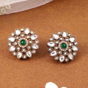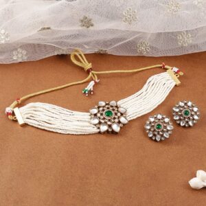 Jewellery Set : This 22K gold-plated choker set features a handcrafted floral Kundan motif with emerald green stone, paired with white pearl beaded strands and stud earrings for traditional bridal elegance. Occasion : Bring your style to a whole new level with this handcrafted piece of jewellery. When you’re celebrating a special Occasion : – a birthday, wedding, or personal milestone – this piece adds that extra something that makes us feel special and looking our best. Material & Care Dimension : Length Size : Necklace : 22 cm, Earrings : 4.5 cm Dimension : Width Size : Necklace : 2.5 cm, Earrings : 2.5 cm Net Quantity : 1 Necklace & 1 Pair of Earrings Net Weight: 48.30 Gram Material : Brass Care Label : It is advisable to avoid contact with water and organic chemicals i.e. perfume sprays. Store jewellery in airtight box. After use, wipe the jewellery with soft cotton cloth.